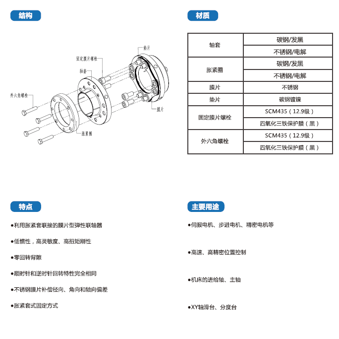 DFPS-T系列聯(lián)軸器采用碳鋼發(fā)黑,利用脹緊套聯(lián)接的膜片型彈性聯(lián)軸器,廣泛用于伺服電機、步進電機、精密電機等。