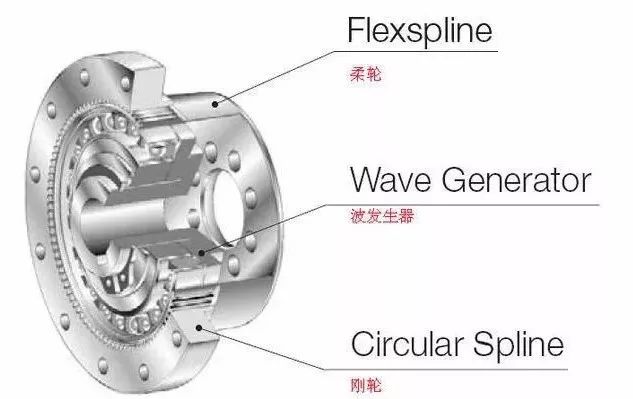 諧波減速機(jī)由“柔輪、波發(fā)生器、剛輪、軸承”這四個(gè)基本部件構(gòu)成。柔輪的外徑略小于剛輪的內(nèi)徑,通常柔輪比剛輪少2個(gè)齒。波發(fā)生器的橢圓型形狀決定了柔輪和剛輪的齒接觸點(diǎn)分布在介于橢圓中心的兩個(gè)對立面。波發(fā)生器轉(zhuǎn)動的過程中,柔輪和剛輪齒接觸部分開始嚙合。波發(fā)生器每正時(shí)針旋轉(zhuǎn)180°,柔輪就相當(dāng)于剛輪逆時(shí)針旋轉(zhuǎn)1個(gè)齒數(shù)差。在180°對稱的兩處,全部齒數(shù)的30%以上同時(shí)嚙合,這也造就了其高轉(zhuǎn)矩傳送。