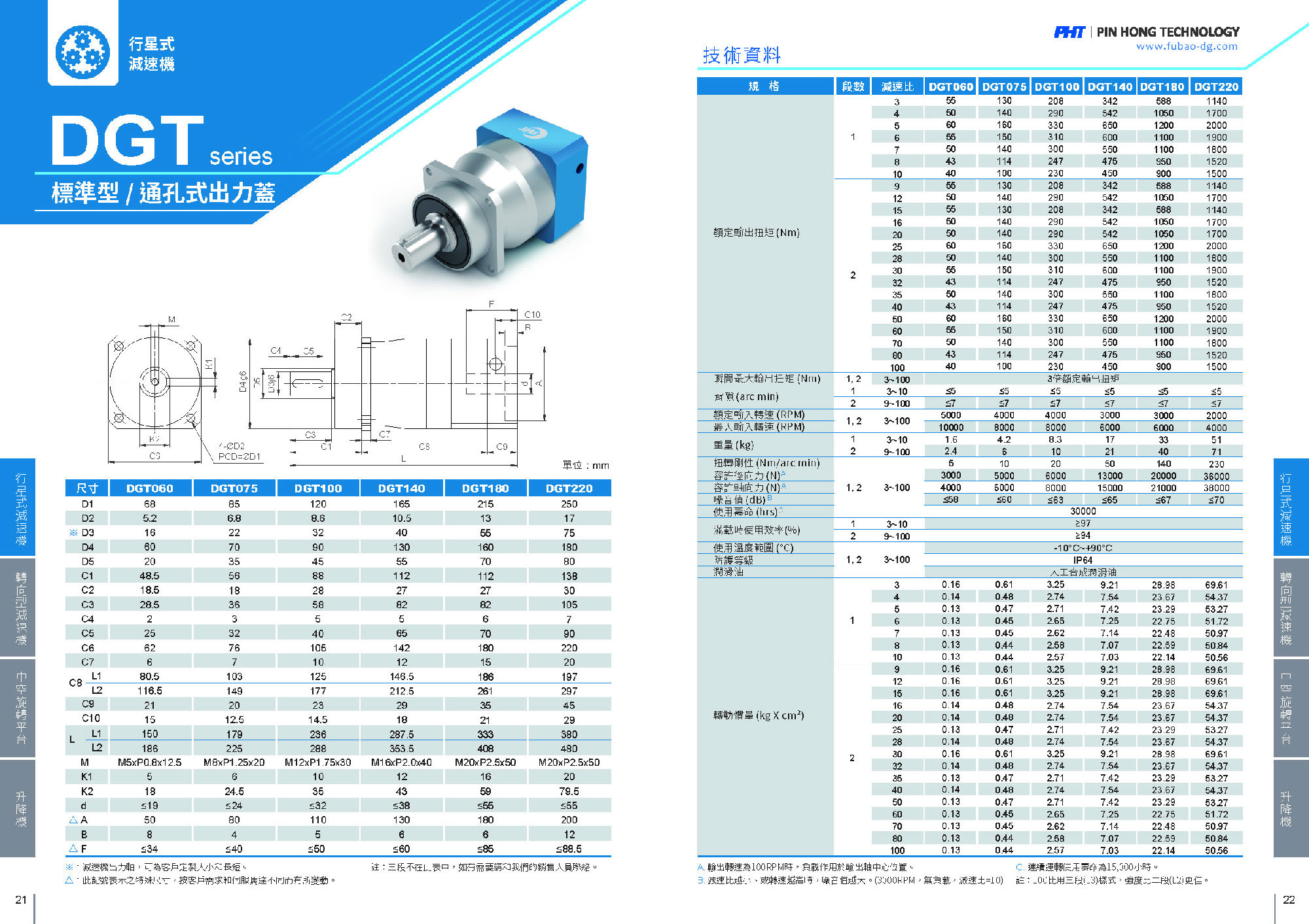 DGT系列是標準型高精度減速機。 適合精度定位之需求,齒輪采用合金鋼材,內部搭配圓錐滾子軸承,使之可承受更佳的負載,安裝孔位為通孔式。 品宏減速機的軸承是用NSK品牌的,齒輪經過碳化,故精度和剛性都比較優(yōu)越!減速機出力軸是可根據客戶的要求去定制大小和長短的。