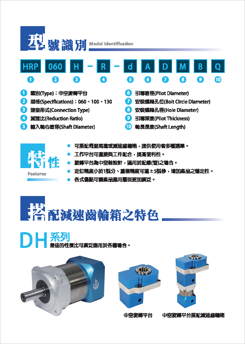 HRP系列是品宏轉(zhuǎn)角減速機(jī)系列。 可搭配伺服馬達(dá)或減速齒輪箱,提供使用者多種選擇。 工作平臺(tái)可直接與工件配合,提高便利性。 旋轉(zhuǎn)平臺(tái)為中空軸設(shè)計(jì),適用于配管之場(chǎng)合。 定位精度小于1弧分,重復(fù)精度可達(dá)±5弧秒,增加產(chǎn)品之穩(wěn)定性。 各式優(yōu)點(diǎn)可讓產(chǎn)品應(yīng)用層面更加廣泛。