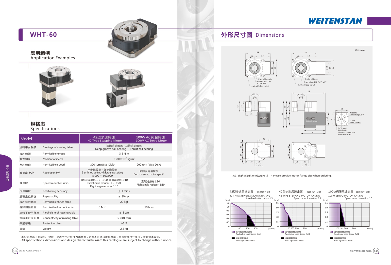 WHT系列中空旋轉(zhuǎn)平臺(tái)。 具有優(yōu)異定位精度與重復(fù)精度的中空旋轉(zhuǎn)平臺(tái),可搭配使用伺服馬達(dá)或步進(jìn)馬達(dá),展現(xiàn)獨(dú)特的性能可靠度。 工作物可直接鎖固。旋轉(zhuǎn)盤面可直接鎖固工作物,提升工件裝載之方便性。 配線方便。此旋轉(zhuǎn)平臺(tái)為中空式設(shè)計(jì),無論是配線或配管均方便。 高精度。定位精度小于1分。重復(fù)精度可達(dá)±5秒。 運(yùn)轉(zhuǎn)動(dòng)作平穩(wěn)。盤面轉(zhuǎn)動(dòng)平穩(wěn),順暢,且定位快速。 適用各種馬達(dá)。中空旋轉(zhuǎn)平臺(tái)可采用各種廠牌之伺服馬達(dá)或步進(jìn)馬達(dá)驅(qū)動(dòng)。